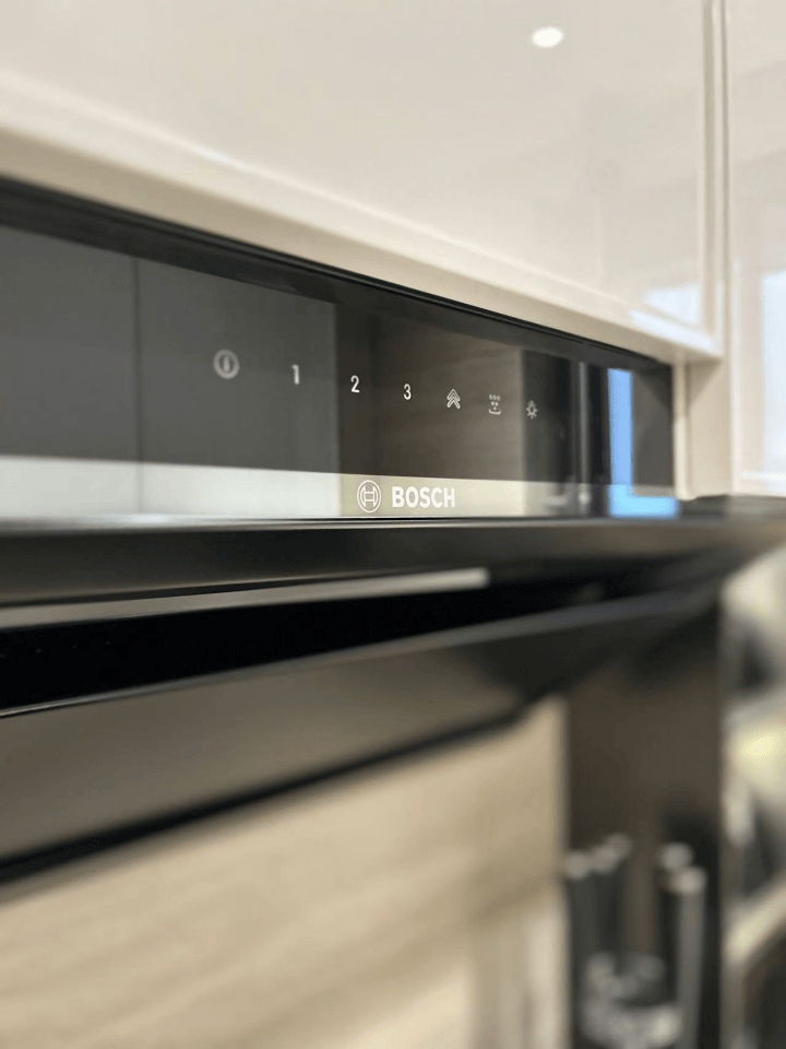 厨房,采用博世(或划一品牌)的吸油烟机、灶具、洗碗机、蒸烤一体机四件套、怡口(或划一品牌)的结尾清水器、摩恩(或划一品牌)的垃圾处置器都通盘配备。
