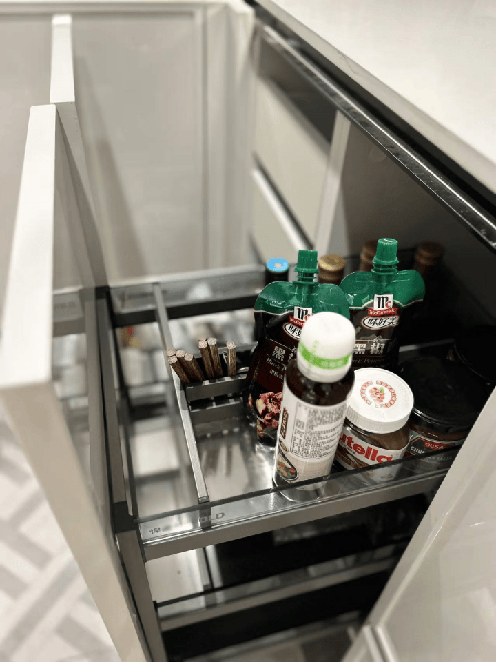 就连冰箱也是交付的。正在百平米3房的户型中放置了东芝的内嵌无霜冰箱、大户型选用顶豪的嘉格纳冰箱。